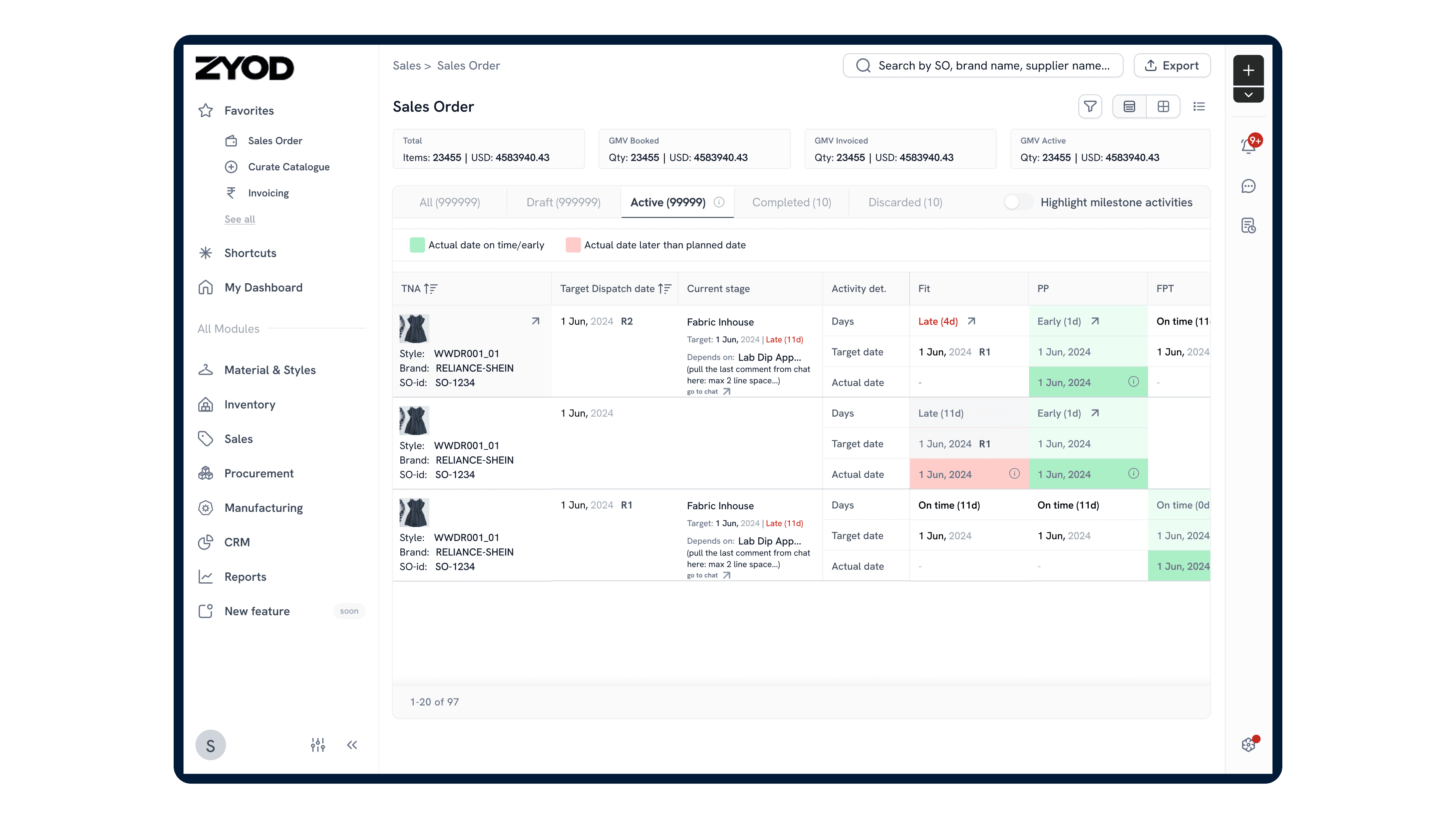The Multi Style Table is the central dashboard of the TNA module in the ZYOD’s ERP.